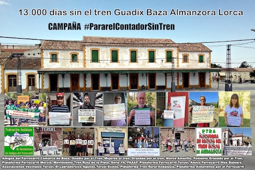 La Asociación Amigos del Ferrocarril Comarca de Baza y la Plataforma Comarca de Guadix por el Tren lideran al grupo de colectivos que han puesto en marcha la campaña «Parar el contador sin tren», en unos momentos en los que se cumplen 13.000 días desde el cierre de la antigua línea férrea Guadix Baza Almanzora Lorca. Junto a los mencionados, forman parte de esta iniciativa colectivos ferroviarios (Granada por el tren, Federación Andaluza de Asociaciones de Amigos del Ferrocarril FAAAF, Plataforma Tren Rural Andalucía, Mujeres al tren, Plataforma Almeriense por el ferrocarril, Marea Amarilla, Plataforma en defensa del ferrocarril de Murcia, Poniente de Granada por el tren, Plataforma por el ferrocarril de Teruel, Movimiento por el tren Ruta de la Plata, Amics del ferrocarril Illes Balears, Asociación El Labradorcico de Águilas) y colectivos de la Revuelta de la España Vaciada (Teruel Existe (con el diputado Tomás Guitarte a la cabeza), Soria Ya o Asociaciones Vecinales de Teruel).