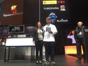 Desde el año 2014, Cosentino patrocina además el “Premio Cocinero del Año en Europa”, un prestigioso reconocimiento que la cumbre Madrid Fusión entrega cada año desde hace cuatro ediciones. En esta ocasión, la organización ha concedido dicho galardón al cocinero austriaco Sebastian Frank, chef del restaurante Horváth de Berlín. De esta forma, el certamen gastronómico quiere destacar su cocina exigente y rebelde que rompe con rígidas líneas tradicionales para abrir nuevos caminos. El acto de entrega ha tenido lugar en el auditorio principal de Madrid Fusión. Vanessa Feo, Responsable de Comunicación y RR.PP. Internacional de Grupo Cosentino, ha hecho entrega de la estatuilla al propio Sebastian Frank.