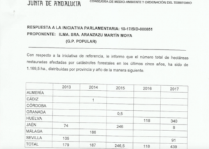 Aránzazu Martín afirma que según la información facilitada por la Junta, de las 1.179,5 hectáreas restauradas desde 2013 en Andalucía, en Almería no se ha producido ni una sola actuación en este sentido, lo que para la parlamentaria es “muy grave”, ya que además se han invertido casi 4,5 millones en toda Andalucía y a Almería no ha llegado ni un solo euro, teniendo en cuenta que solo en el incendio de Alhama de Almería, en el año 2014 se calcinaron aproximadamente 3.200 hectáreas de pinar y matorral en la Sierra de Gádor, el doble de lo que el Gobierno andaluz ha restaurado en toda Andalucía en los últimos cinco años.