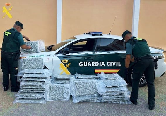Al inspeccionar el vehículo, los agentes percibieron que del interior de las bolsas emanaba un fuerte olor a marihuana, lo que motivó una revisión exhaustiva. Al inspeccionarlas se constató que las 12 bolsas contenían un total de 65 kilogramos de cogollos de marihuana empaquetadas al vacío, con las inscripciones “PRO” y “BOMBA” en su exterior. Además, se incautaron 2.700 euros en efectivo, distribuidos en billetes de 20, 10 y 5 euros (denominaciones comúnmente utilizadas para el cambio en la venta de sustancias estupefacientes), un spray de defensa, además de unos grilletes con llave y dos defensas extensibles, estos últimos considerados objetos de uso prohibido para particulares.