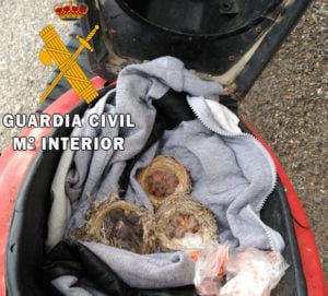 Dentro de las actuaciones que lleva a cabo la Guardia Civil en materia de protección del medio ambiente, el pasado día 9 del presente mes, los agentes de la Guardia Civil localizan un total de 13 crías de fringílidas aún en sus nidos.