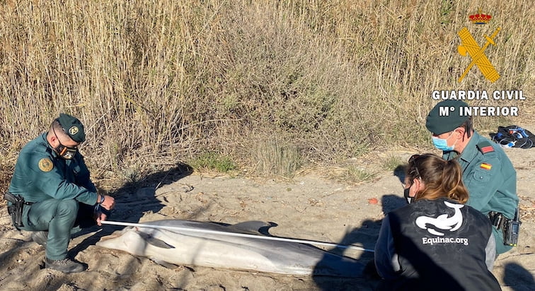 Agentes de la comandancia de la Guardia Civil de Almería prestaron protección y apoyo a personal técnico de Equinac en el varamiento de un delfín en la desembocadura del Río Aguas en Mojácar.