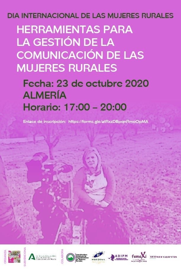 Este viernes 23 de octubre a partir de las 17:00 horas, Almería en formato on line acogerá la cuarta de las ocho jornadas de este programa organizado por La Federación de Mujeres Comarca Nororiental de Málaga con la colaboración de la Coordinadora Andaluza de Asociaciones de Mujeres Rurales COAMUR y la financiación del Instituto Andaluz de la Mujer de la Junta de Andalucía. La asesora provincial del IAM, María José Navarro Pinto inaugura la jornada enmarca en los actos de conmemoración del Día Internacional de Las Mujeres Rurales ‘Herramientas para la comunicación de Las Mujeres Rurales’ junto con la presidenta de la entidad, Adela Romero.