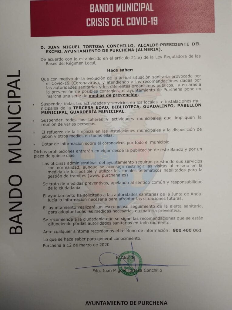 Bando oficial de Ayuntamiento de Purchena en relación con la situación sanitaria del Coronavirus y la suspensión de servicios municipales durante 15 días.