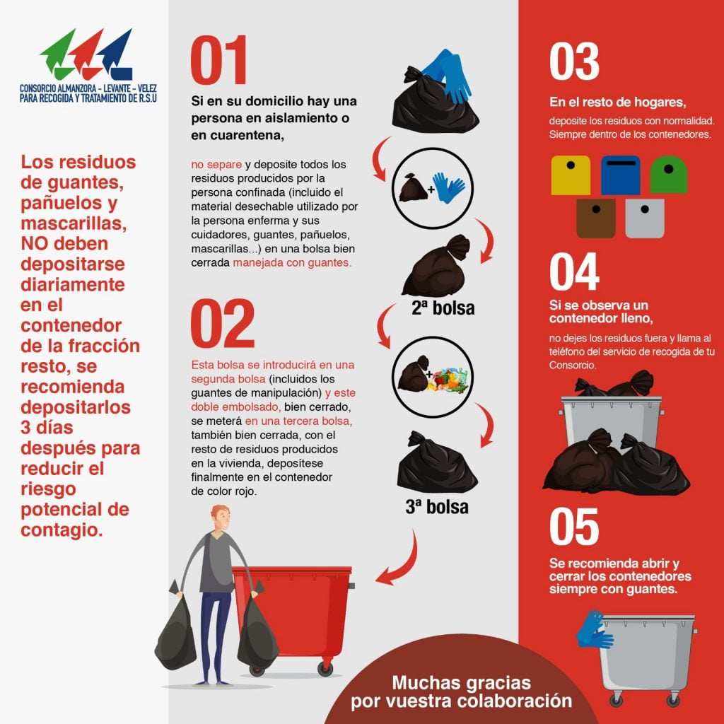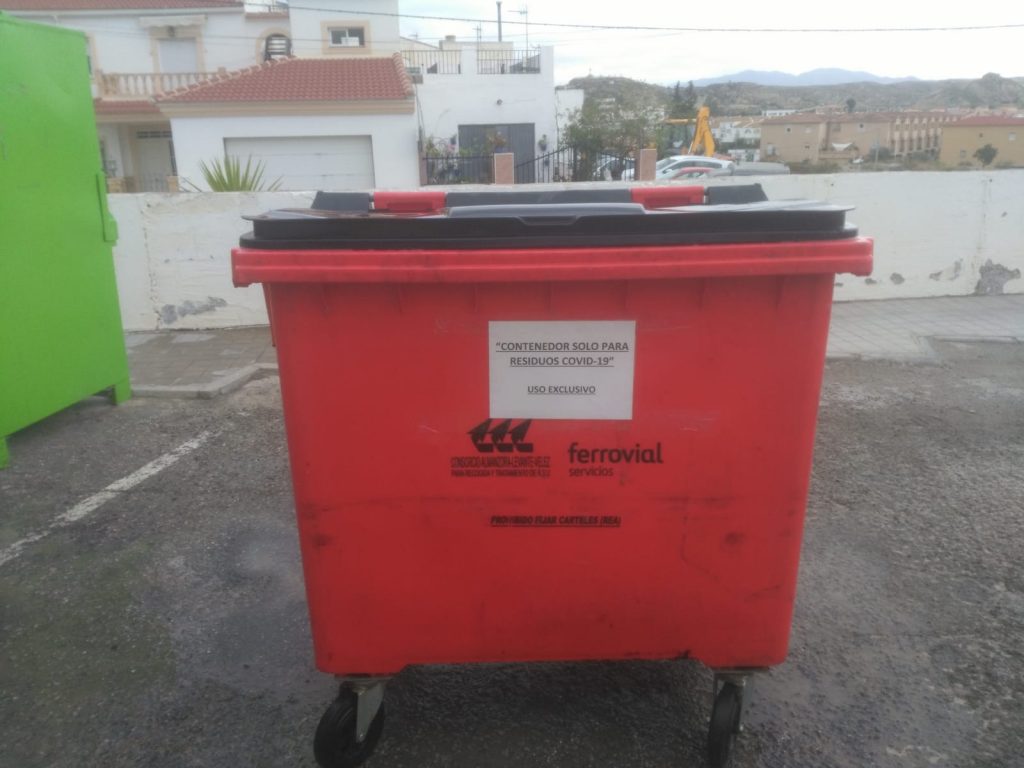 El Consorcio Almanzora Levante Vélez, le recuerda que si en su hogar vive una persona en aislamiento o cuarentena afectada por la Covid-19, es aconsejable que los residuos de guantes y mascarillas se depositen en el contenedor rojo, tres días después de utilizados, para minimizar el riesgo potencial de contagio.