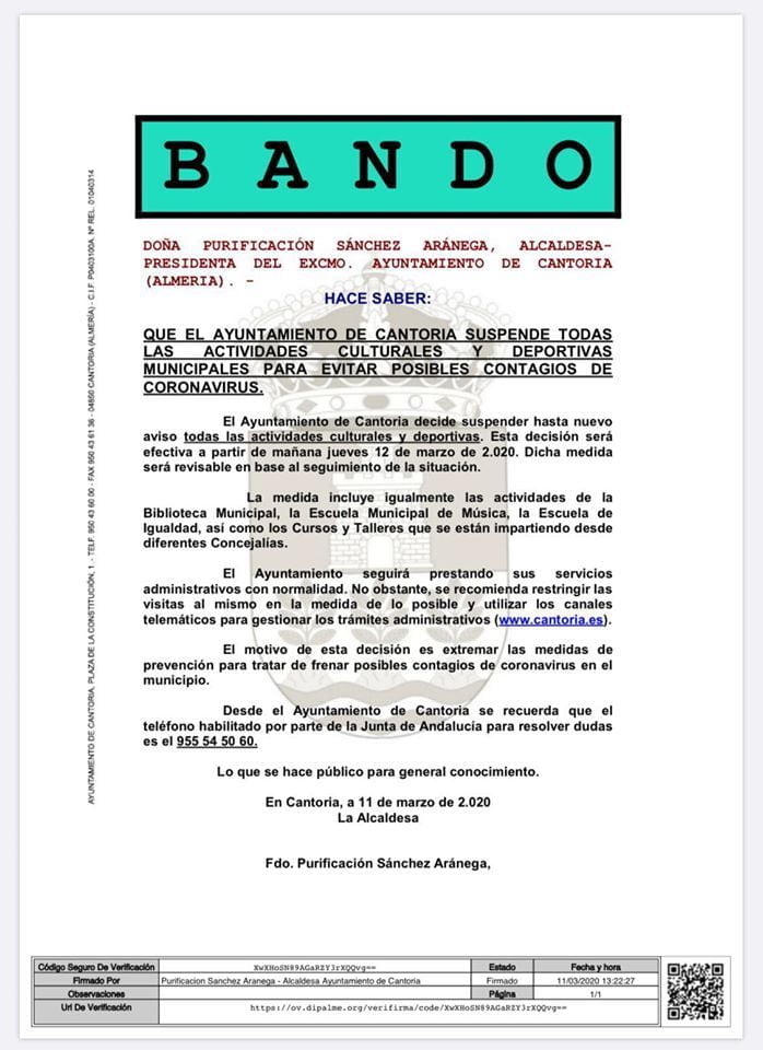 Las medidas de prevención por la llegada del coronavirus a nuestra comarca se siguen tomando desde algunos consistorios. Albox fue uno de los municipios en decidir suspender diferentes actividades deportivas, culturales y de ocio. Cantoria, ayer miércoles emitió un bando en el que se establece que a partir de hoy jueves 12 de marzo y hasta nuevo aviso, se suspenden todas las actividades deportivas y culturales. La medida incluye las actividades de la Biblioteca Municipal, la Escuela de Música, la Escuela de Igualdad, así como diferentes cursos y talleres programados.