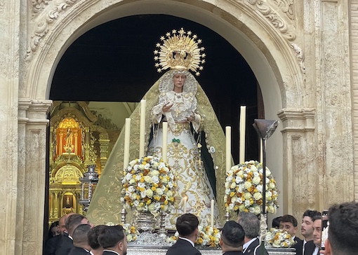 La Virgen lucía ataviada radiante gracias a la labor de su vestidor, el hermao del Paso Blanco don Manuel Jesús Sánchez Reche, que exornó además las andas con un exquisto arreglo floral en tonos blanco y amarillo en alusión a la bandera vaticana dado el carácter jubilar de los cultos que se celebraban.