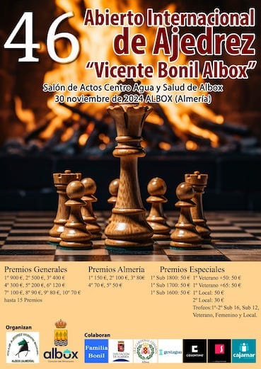 Fiel a su cita de noviembre, el municipio de Albox acoge este sábado 30 de noviembre, la 46 edición del ‘Torneo internacional de ajedrez Vicente Bonil Albox’. Un evento que a lo largo de los años se ha consolidado como el torneo más importante de Andalucía de ajedrez activo y todo un clásico en el panorama internacional.