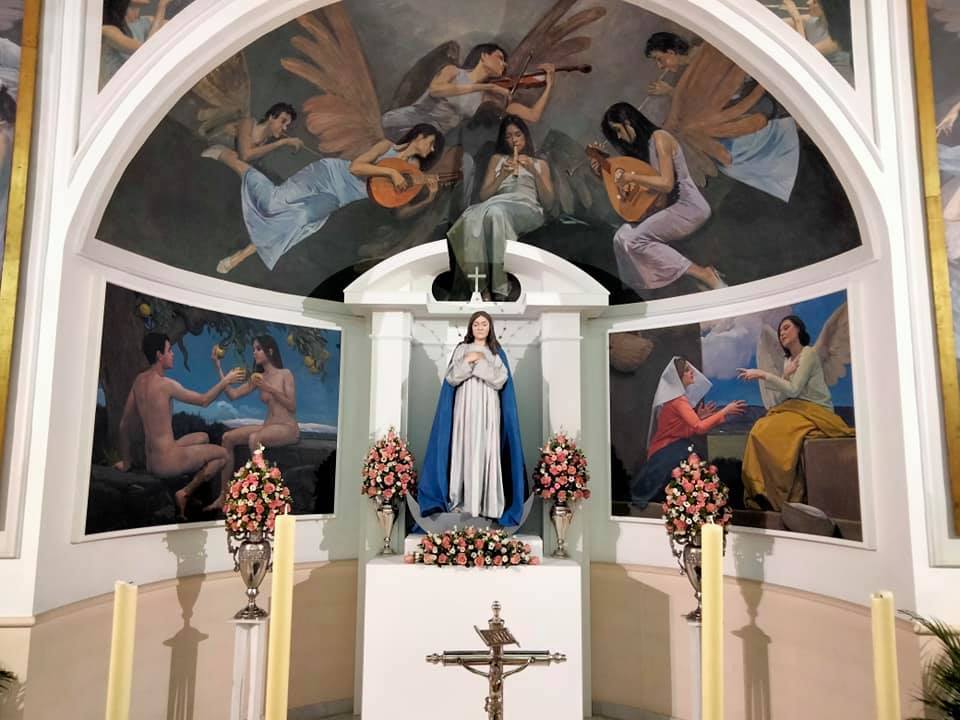 Un retablo contemporáneo, pero que bebe influencias neoclásicas con sus molduras y frontón partido, hacen de nimbo a la imagen de la Purísima y coronan el conjunto con la Santa Cruz. Todo ha sido confeccionado con maderas, lacadas de blanco impoluto. El conjunto queda completado con dos nuevos lienzos, generosamente donados por Andrés García Ibáñez. Ambos, que recogen los pasajes bíblicos proclamados en la liturgia inmaculista, completan el mensaje. Se tratan del Pecado Original, cuando nuestros primeros padres rechazaron el plan de Dios, y la Anunciación, cuando la Virgen Santísima aceptó el plan salvífico de Dios. Son dos lienzos pletóricos de significado místico, que invitan al descubrimiento de cada uno de los elementos que los componen.