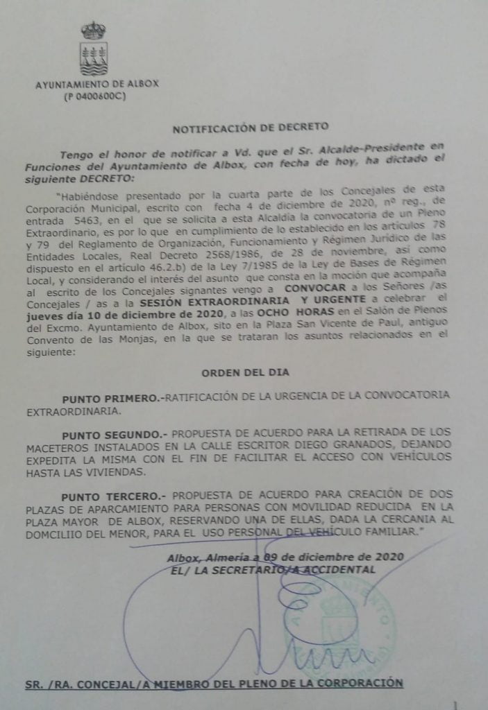 Ambos grupos pretenden dos cosas que se recogen en la convocatoria; que se quiten los maceteros instalados en la calle Escritor Diego Granados, dejando expedita la misma con el fin de facilitar el acceso con vehículos hasta las viviendas y la creación de dos plazas de aparcamiento reservadas para personas con movilidad reducida en la Plaza Mayor de Albox, reservando una de ellas, dada la cercanía al domicilio del menor, para el uso personal del vehículo familiar.
