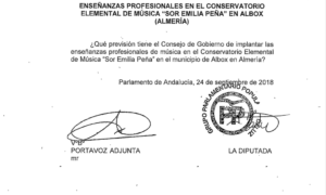 En el escrito firmado por la parlamentaria Aránzazu Martín, se pregunta “¿Qué previsión tiene el Consejo de Gobierno de implantar las enseñanzas profesionales de música en el Conservatorio Elemental de Música, Sor Emilia Peña en el municipio de Albox?”.