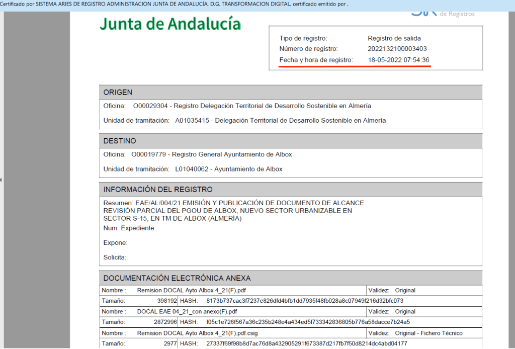 Esta solicitud, según la documentación que obra en poder de esta redacción, fue contestada y notificada al Ayuntamiento de Albox el día 18 de mayo de 2022. Inclusive fue publicada en la web de la Consejería de Medioambiente de la Junta de Andalucía ese mismo día. Desde entonces hasta hoy, ha pasado exactamente un año y una semana (ver foto de portada).