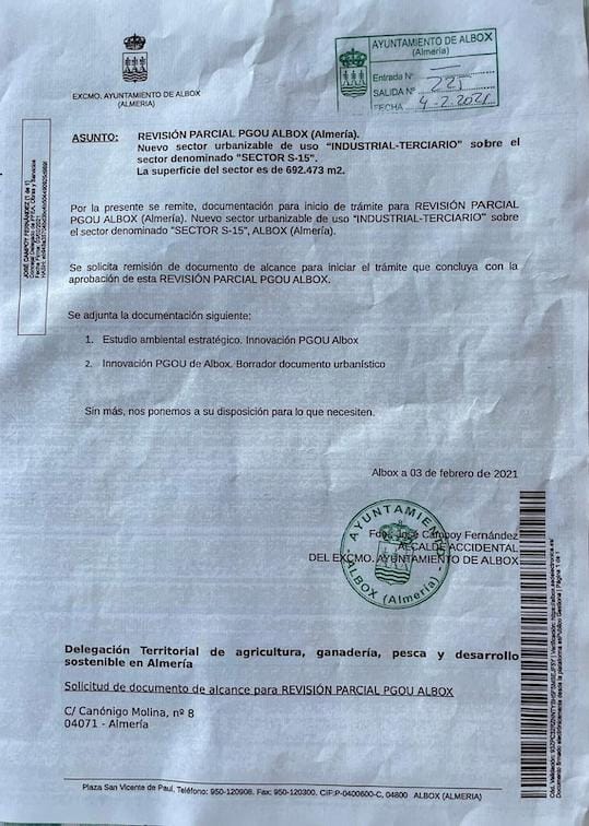 El alcalde de Albox Francisco Torrecillas, hace unos días mostró en un video de campaña una solicitud dirigida a la Delegación de Agricultura, ganadería, pesca y desarrollo sostenible en Almería (la actual Delegación de Desarrollo Sostenible y Economía Azul) en la que pedía la remisión del Documento de Alcance para iniciar el trámite que concluya con la aprobación de la Revisión Parcial que afecta al Sector S-15 de Albox, el polígono industrial de La Venta.