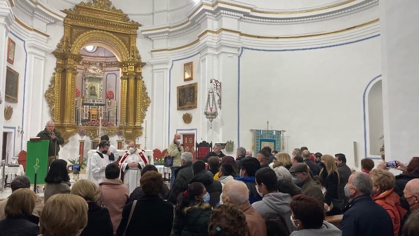 Precisamente estos pequeños, junto con la Cuadrilla de Ánimas del Saliente dirigida por Francisco Martínez Botella, fueron los que llenaron de alegre música este maravilloso enclave de la sierra de las Estancias. Coplas y sones que, en más de una ocasión, hicieron brincar y bailar parrandas a los peregrinos en el amplio atrio. En la enorme explanada, mientras tanto, varias decenas de vehículos recibieron pacientemente la bendición del Rector con su correspondiente dosis de agua bendita.