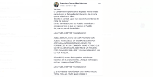 El alcalde de Albox, se olvida que nos representa a todos, y por tanto debería estar a la altura de los acontecimientos. El insulto que permanentemente utiliza a través de redes sociales, habla más de él, que de los destinatarios de sus vejaciones. Sin ir más lejos, hace unos días y a cuenta del grado superior del Conservatorio de Música que se irá a Cuevas del Almanzora, Torrecillas dice textualmente: “Adela Segura, esto estaba pactado con Albox y lo sabías, en compensación por apoyar la integración del Fenoy, tú perteneces a esa comisión y has votado que se instale en Cuevas, eso tiene un nombre, pero como eres mujer y yo un caballero, no lo voy a decir…”