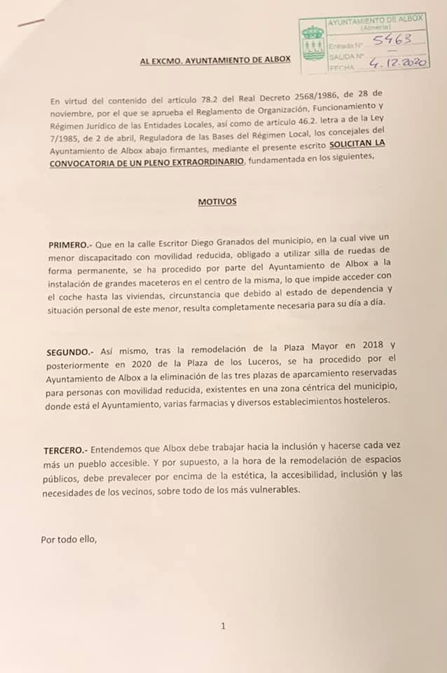 Los motivos expuestos por los siete concejales en la oposición son «Que en la calle Escritor Diego Granados del municipio, en la cual vive un menor discapacitado con movilidad reducida, obligado a utilizar silla de ruedas de forma permanente, se ha procedido por parte del Ayuntamiento de Albox a la instalación de grandes maceteros en el centro de la misma, lo que impide acceder con el coche hasta las viviendas, circunstancia que debido al estado de dependencia y situación personal de este menor, resulta completamente necesaria para su día a día«.