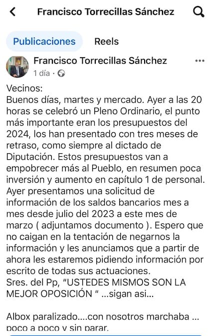 Pero lo que sorprendió al otro día del Pleno, fue ver en las redes sociales de Torrecillas como este criticaba las cuentas presentadas para 2024; “Estos presupuestos van a empobrecer más al pueblo, en resumen, poca inversión y aumento en el Capítulo 1 de personal”, afirmaba el concejal en su perfil de Facebook. La sorpresa que ha causado su crítica, es que los tres concejales de UCIN, grupo político al que se supone representa Torrecillas, votaron a favor de los presupuestos, lo que ha dejado al descubierto lo que pareciera una disparidad de criterios en el seno del grupo independiente. Por otra parte, la plantilla de trabajadores del Ayuntamiento de Albox fue incrementada en un 41 por ciento por la propia gestión de Torrecillas, como se expuso en el Pleno. «Destinar más del 60% de los ingresos al pago de personal, lastra las inversiones», aseguró la portavoz del PSOE Mary Trinidad, grupo que también votó a favor del presupuesto 2024.