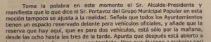 El alcalde Francisco Torrecillas, según recoge el acta, manifestó que no se podía aparcar en un lugar reservado para dos coches oficiales y que la restricción es solo para días hábiles de lunes a viernes desde las 8 y hasta las 3 de la tarde.