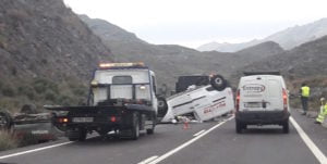 El siniestro se ha producido sobre las 8,40 horas, cuando varios conductores que circulaban por la carretera A-349 han alertado de una colisión múltiple de tres vehículos a la altura del kilómetro 13 en dirección a Olula, cerca de la plataforma solar de Tabernas.