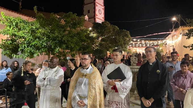 Un poco más adelante, cuando los peregrinos alcanzaron la aldea, quedaron deslumbrados. Cada casa y cada palmo de la calle estaba profusamente decorado y, el breve recorrido hasta el templo, señalado con cirios y alfombrado primorosamente. El Párroco, José Rubén Fernández Pelegrina, y el Vicario Parroquial, Theodore Lejeune Nken Nyobe, recibieron a todos y pronunciaron un sentido discurso de bienvenida. Era la segunda vez, tras la visita de 1987, que la Pequeñica visitaba esta aldea.