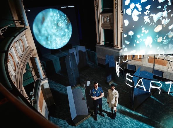 A través del recorrido por los diferentes espacios y niveles del Teatro se puede visualizar el proyecto integral de investigación llevado a cabo por Cosentino sobre I+D, formulación de materiales y sostenibilidad que se concreta en EARTHIC®. Empezando por la platea y el escenario, dónde se genera un paisaje envolvente presidido por unas esculturas emergentes elaboradas en los colores de EARTHIC® que fusionan diseño, sostenibilidad y arte. Esta parte escultórica está acompañada de una columna de pantallas holográficas en forma de cascada desde el techo, así como de la pantalla principal del escenario a modo de escenario lunar.