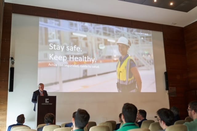 El delegado territorial de Salud y Consumo, Juan de la Cruz Belmonte, ha visitado la sede central del Grupo Cosentino, en el municipio de Cantoria, donde ha asistido a la presentación del programa de iniciativas corporativas dirigidas a sus empleados en todo el mundo que la firma almeriense desarrollará durante las próximas semanas bajo el lema ‘Stay Safe, Keep Healthy’.