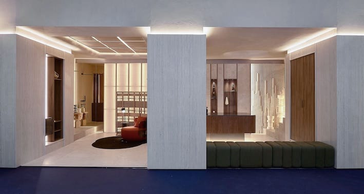 “Transversal” se plasma en un espacio como si de una caja vacía se tratase, perforada con una materialidad terrosa, cuasi pétrea. Caja que se recubre y protege en sus accesos con una faja superpuesta que, a la vez que se va introduciendo en el espacio, se transforma en muros equipados, donde aparecen diferentes elementos constructivos en su interior. Un juego de materialidades, que genera una transición desde lo etéreo (los reflejos de la luz) a lo más tectónico (la piedra). Este concepto de templo arquitectónico es posible gracias a la amplia versatilidad de aplicaciones de las superficies de Cosentino, que lo dotan de elegancia, diseño y sostenibilidad real.