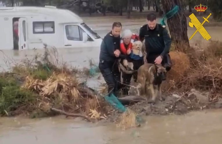 La rápida intervención de la Guardia Civil y Protección Civil ha permitido el rescate de dos personas de nacionalidad extranjera, de 78 y 79 años, que quedaron atrapadas en el interior de su caravana junto a sus dos perros tras ser sorprendidos por una riada en la playa de Quitapellejos, en el término municipal de Cuevas del Almanzora.