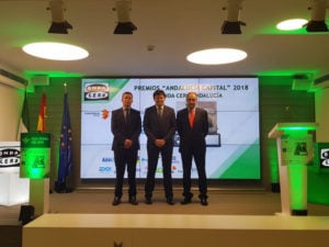 La Asociación de Empresarios del Mármol de Andalucía ha sido galardonada, en la categoría de Cooperación Empresarial, en los Premios Andalucía Capital 2018. Antonio Sánchez, presidente de AEMA junto a dos miembros de su Junta Directiva, Jesús Posadas y Luis Segura, presidentes de las Comisiones de Comercialización e Industria, respectivamente, han participado en el acto y recogido el galardón este martes, 27 de noviembre, en el auditorio de Caja Rural del Sur de Sevilla.