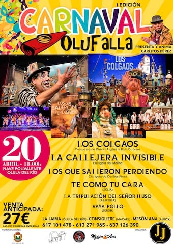Los aficionados al carnaval están de enhorabuena, Olula del Río celebra la primera edición del carnaval Olufalla, un festival de 6 horas del mejor carnaval, un formato que se si bien desde hace años se viene llevando a cabo en otras provincias, por primera vez desembarca en la provincia.