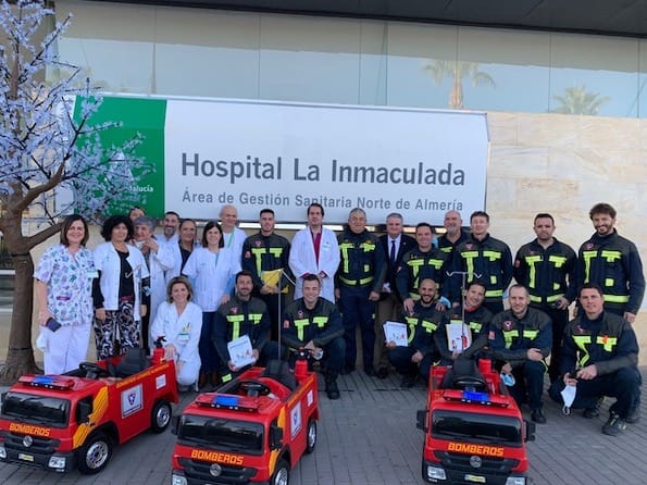 La Asociación de Bomberos del Levante Almeriense se han desplazado hasta el área de pediatría para visitar a los niños ingresados y realizar una donación de tres camiones de bomberos para su uso mientras tengan que permanecer en las dependencias hospitalarias en estos días tan señalados.