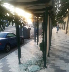 Momentos después denunció una segunda víctima en representación del Ayuntamiento de Olula, relatando que, en el mismo lugar en la avenida Pintor Antonio López, alguien había fracturado la luna de la marquesina donde tiene su parada el autobús de línea.
