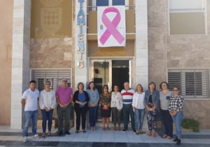 Concejales del equipo de gobierno, presidenta y miembros de la Asociación Contra el Cáncer de Fines y funcionarios del Ayuntamiento se fotografían juntos con motivo del #DíaMundialdelCáncerdeMama bajo un lazo rosa en la fachada del Ayuntamiento y que hasta finales de octubre estará expuesto «como muestra de nuestro compromiso con la lucha de todas las mujeres que se enfrentan a esta enfermedad».