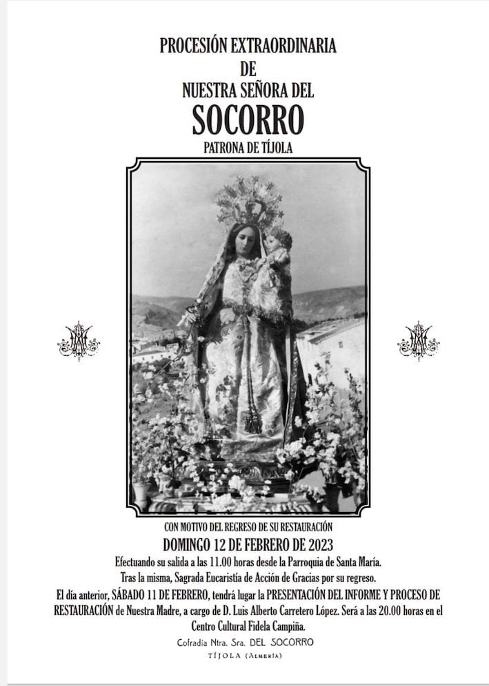 Este finde semana el pueblo de Tíjola vivirá días muy especiales. La Hermandad y Cofradía de Ntra. Sra. del Socorro, vivirán el regreso de la imagen de la Virgen del Socorro tras 5 meses de restauración.