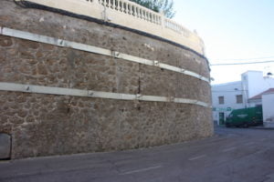 El resultado de este refuerzo representa un impacto visual en el paisaje urbano del núcleo con un juicio negativo por parte de la ciudadanía, lo cual ha llevado al Consistorio a impulsar una actuación artística de embellecimiento y puesta en valor del muro, entendido éste como lienzo y fachada que acompaña el recorrido de acceso al núcleo histórico y a la Plaza Nueva como principal centro de reunión de la población. El muro sobre el que se pretende actuar tiene una longitud aproximada de 80 metros. La altura es decreciente, comenzando por unos 8 metros de altura en la unión con el edificio de Casa de la Cultura, hasta llegar a los 2 metros, junto al acceso a la plaza. Toda la longitud del muro está coronada por el banco corrido que representa el perímetro de la plaza, compuesto por el asiento y una balaustrada de hormigón prefabricado, con una altura aproximada de 1,60 metros En el encuentro entre el muro y el elemento de coronación hay una instalación vista de cableado de iluminación exterior y algunas cajas de registro, que también deberán ser integradas en el proyecto. El muro en planta tiene un trazado en forma de J con una parte curva, que es sobre la que se ha realizado la contención, y un tramo recto. La superficie sobre la que se sitúa el refuerzo estructural descrito tiene una longitud aproximada de 40 metros y se sitúa sobre la parte de más altura del muro.