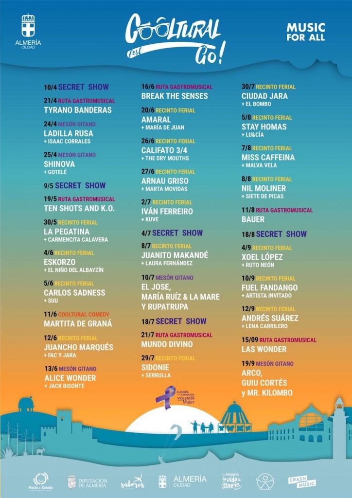 Los primeros datos arrojan que Cooltural Go! cumplirá la función de atractivo para el turismo musical, puesto que las compras se han producido, además de Almería, desde otras seis provincias de todo el país. El arranque ha sido tan bueno que durante los primeros minutos el servidor de venta se colapsó momentáneamente y, al igual que el año pasado, se prevé desde ya que para muchos de los eventos se cuelgue el cartel de entradas agotadas, en una programación que contempla más de 40 convocatorias desde el mes de abril al mes de septiembre, incluyendo grandes conciertos en el recinto principal en el Ferial, también otros matinales en el Mesón Gitano, Secret Show, Cooltural Kids, Cooltural Comedy o Ruta Gastromusical.