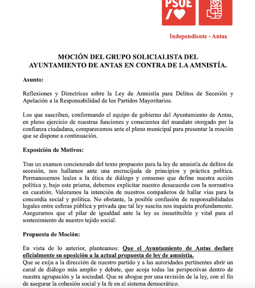 En el apartado de Propuesta de Moción, el grupo del PSOE de Antas, plantea que «el Ayuntamiento de Antas declare oficialmente su oposición a la actual propuesta de ley de amnistía. Que se exija a la dirección de nuestro partido y a las autoridades pertinentes abrir un canal de diálogo más amplio y debate, que acoja todas las perspectivas dentro de nuestra agrupación y la sociedad. Que se abogue por una revisión de la ley, con el fin de asegurar la cohesión social y la fe en el sistema democrático».