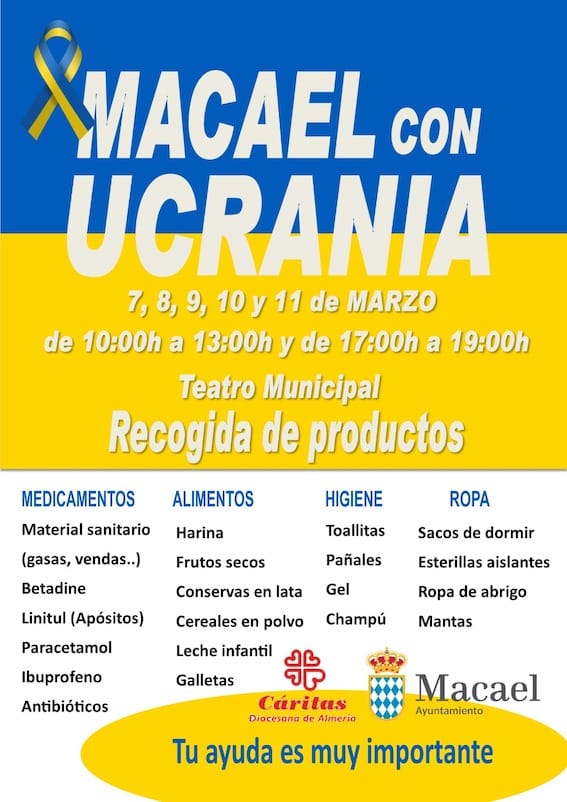 “Entre nosotros viven desde hace años familias ucranianas. Por ellas y porque no podemos ser ajenos a los que está sucediendo, desde el ayuntamiento nos hemos puesto a su disposición para ayudar y poner en marcha esta campaña de recogida de alimentos y productos sanitarios durante toda la semana. Estoy seguro que Macael se volcará en ayudar” asegura el alcalde, Raúl Martínez.