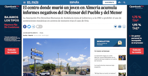 La muerte del joven Ilias T., de 18 años, en el centro de menores de Tierras de Oria el pasado 1 de julio ha vuelto a poner de relieve muchas de las carencias señaladas en recientes informes por el Defendor del Pueblo y el Defensor del Menor. La Asociación Pro Derechos Humanos de Andalucía (APDH) ha recordado en un documento las denuncias recogidas en sus informes e insta a las autoridades españolas y a la ONU a prohibir el uso de contenciones mecánicas. El chico falleció tras recibir un «protocolo de contención» de parte de seis guardias jurado del centro, pero la autopsia preliminar señala «signos asfixiáicos generales» y revela la existencia de un vídeo de los hechos (sin sonido) por lo que “no descarta la compresión abdominal o la sofocación con almohada/colchón en esta muerte».