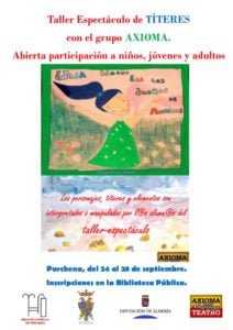 Del lunes 24 al viernes 28 de septiembre se llevará a cabo en Purchena un taller de títeres con el gran grupo Axioma, que finalizará con un espectáculo.
