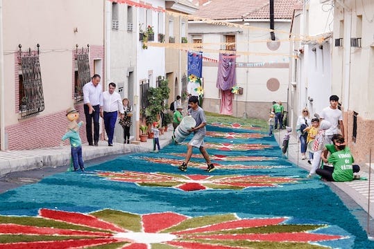Esta fiesta consiste en vestir las calles por donde discurre la virgen, de una alfombra con más de kilómetro y medio de serrín tintado”.