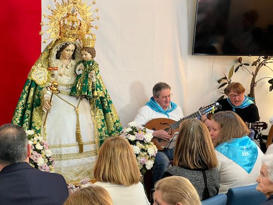 Finalizado el almuerzo, mientras los usuarios rezaban, cantaban y ofrecían a la Santísima Virgen, se proyectaron diversos vídeos de la Virgen y la Asociación de Amas de Casa “La Aurora” ofreció una merienda a los allí presentes.